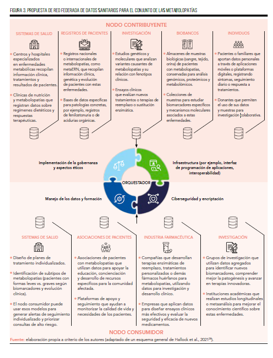 La Figura 3 recoge una propuesta de red federada de datos sanitarios para el conjunto de las metabolopatías, en la que cada centro puede actuar como nodo contribuyente, aportando datos localmente entrenables, y como nodo consumidor, accediendo a modelos agregados sin exponer información sensible.
