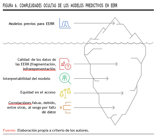 En el contexto de las EERR, la analítica avanzada y el uso de IA permiten extraer patrones significativos y generar modelos predictivos a partir de grandes volúmenes de información clínica y biomédica, superando muchos de los obstáculos metodológicos de la medicina tradicional centrada en estudios restringidos42-44. Sin embargo, la integración de estas herramientas en la clínica y la investigación requiere de una evaluación crítica constante que permita distinguir las correlaciones falsas de los hallazgos robustos y clínicamente relevantes45.