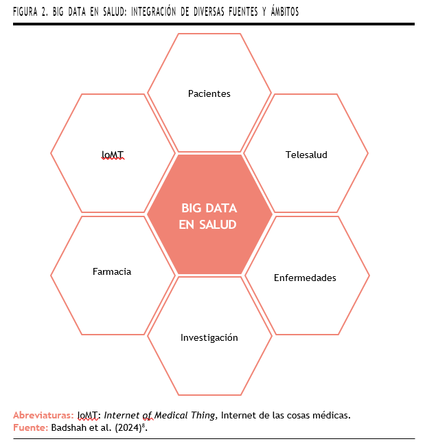 Hay que tener en cuenta que todos estos datos se recopilan a través de diversas fuentes, desde registros electrónicos, datos farmacéuticos y genómicos, ensayos clínicos o telemedicina, cuya implementación ha sido creciente desde la pandemia de la COVID-19. Otra fuente emergente de información es la conocida como el Internet de las Cosas Médicas (IOMT del inglés Internet of Medical Things)7, entre las que se encuentran las aplicaciones móviles, smartwatches y otro tipo de sensores (Figura 2)1.