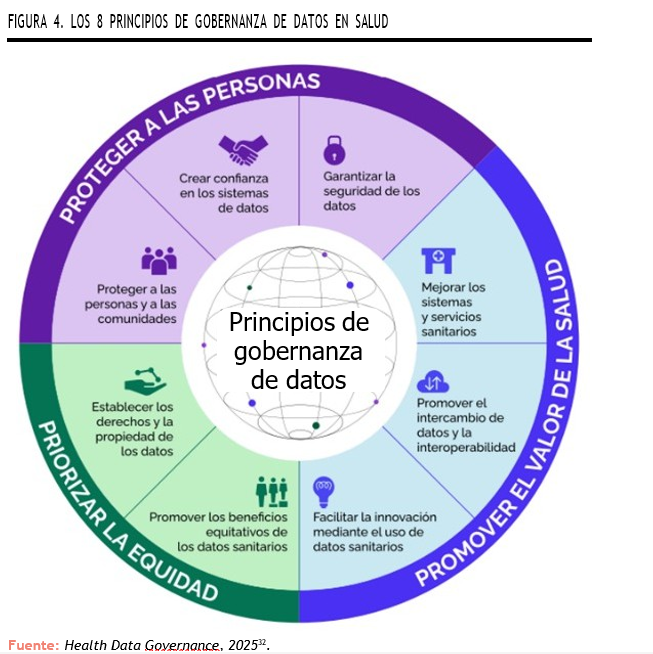 Para alcanzar una gobernanza de datos eficaz en el ámbito de la IA, es esencial que los gobiernos integren y conecten la información procedente de los distintos sistemas sanitarios y sociales. Esto implica crear repositorios de alta calidad, accesibles a investigadores acreditados, junto con entornos analíticos seguros o mecanismos adecuados para la extracción de datos34.