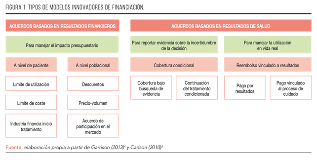 - Pago vinculado al proceso del cuidado: bajo este tipo de acuerdos, se reembolsa el coste de la tecnología (p.ej., test diagnóstico) en función del impacto que éste tenga en el proceso del cuidado (por ejemplo, si la utilización de este test permite la reducción de tratamientos que no son necesarios). Este tipo de acuerdos se utiliza más para tecnologías sanitarias que para medicamentos.