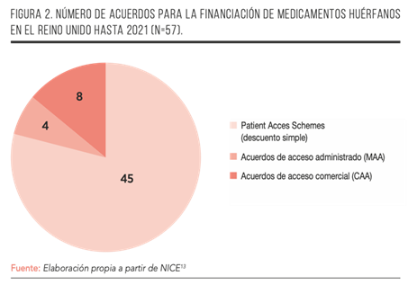 La experiencia del NHS británico es quizás una de las mejor documentadas, con unos esquemas de financiación equivalentes a los ARC que reciben el nombre de Patient Access Schemes (PAS). Hasta 2021, el NHS disponía de 329 acuerdos de financiación vigentes para medicamentos, en su mayoría oncológicos, de entre los cuales al menos 57 se habían suscrito con MMHH, lo que supone, aproximadamente una quinta parte del total13(Figura 2).