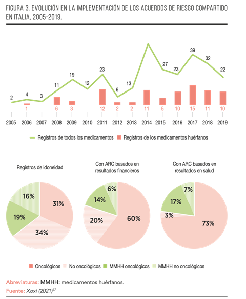 Otro ejemplo de implementación de ARC es Italia, con un potente sistema de registros nacionales administrado por la Agencia Italiana de Medicamentos (AIFA)17,18. En este país, el primer ARC para MMHH se firmó en el año 2006 y en el año 2012 estaban ya en marcha 24 acuerdos de este tipo, en su mayoría, para MMHH en el área de la oncología17. A este respecto, Xoxi et al (2021)17 han llevado a cabo un análisis de los registros basados en indicaciones de la AIFA y la información asociada de la Agencia Europea del Medicamento (EMA) durante un periodo de 15 años (2005-2019), evaluando sus características y comparando los MMHH frente al resto de medicamentos, tanto para las indicaciones oncológicas como para las no oncológicas.