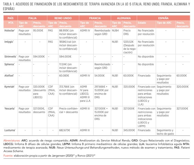 – En Italia y España se observa un sistema de financiación para los MTA muy parecido, basado, la mayoría de las veces, en el pago por resultados, tal y como comentamos anteriormente. De esta manera, en Italia se han adquirido Holoclar® y Strimvelis® por un importe de 95.000 y 594.000€, respectivamente22; terapias que no llegaron a ser financiadas en España23. Por el contrario, Alofisel® sí se encuentra financiado en nuestro país, aunque con restricciones a la indicación autorizada23; en este caso, se llegó a un acuerdo de pago por resultados que alcanzó los 60.000€22 y se acordó una revisión anual de las ventas y de los precios fijados, para asegurar que se encuentran bajo los parámetros establecidos legalmente y, en caso contrario, proceder a su adecuación mediante la rebaja correspondiente24.