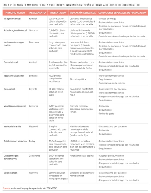 En 2019, creó VALTERMED, un sistema de información compartida dentro del SNS que permite medir los resultados en salud obtenidos por los medicamentos de última generación financiados públicamente, con el fin de compartir información real y mejorar la eficiencia del sistema. Los medicamentos incluidos en VALTERMED son fármacos de alto coste a los que generalmente se les aplican acuerdos de pago por resultado. El primero fue el CAR-T tisagenlecleucel (con designación de MMHH), al que se aplicó un acuerdo de financiación innovador28 por un total de 327.000 euros, con un primer pago del 50% una vez finalizada la infusión del medicamento y un segundo pago a los 18 meses de tratamiento en función de la respuesta obtenida en términos de supervivencia global22,29.