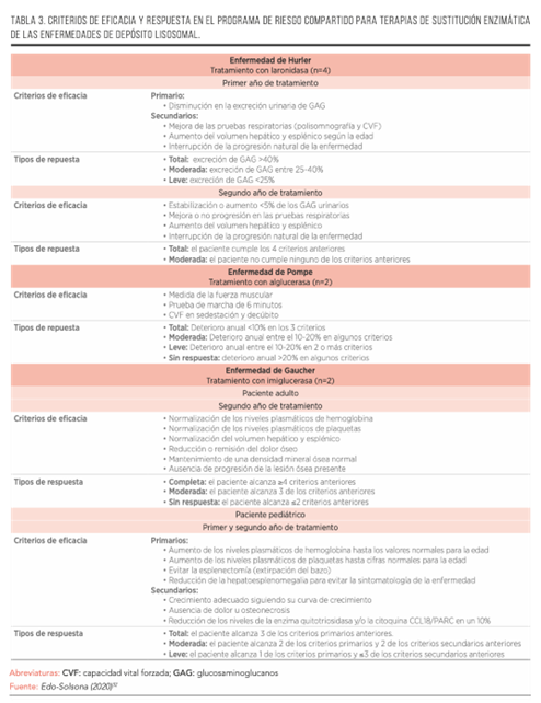 A la hora de establecer el acuerdo, se definieron para cada TSE las variables y los criterios de respuesta al tratamiento (Tabla 3) seleccionados según la experiencia de los facultativos y de la evidencia disponible32. Así, por ejemplo, la efectividad de laronidasa se evaluó a través de la reducción en la excreción de glucosaminoglucanos en orina, de la mejora de las capacidades pulmonar, hepática y esplénica, y en función de cuánto disminuyó la progresión natural de la enfermedad, a uno y dos años del tratamiento32.