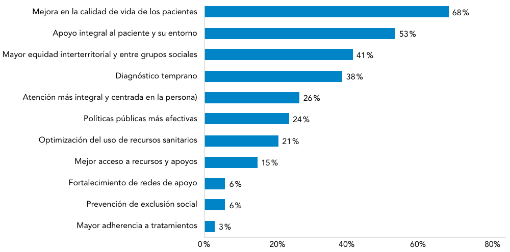 Al explorar los principales beneficios de integrar los determinantes sociales en el manejo de las personas con enfermedades raras, los encuestados destacaron, en primer lugar, la mejora en la calidad de vida de los pacientes (68%) y el apoyo integral al paciente y su entorno (53%). Otros beneficios relevantes incluyen la mayor equidad interterritorial y entre grupos sociales (41%), el diagnóstico temprano (38%) y la atención más integral y centrada en la persona (26%). En menor medida, se mencionaron políticas públicas más efectivas (24%), optimización del uso de recursos sanitarios (21%) y mejor acceso a recursos y apoyos (15%). Finalmente, la prevención de la exclusión social (6%), el fortalecimiento de redes de apoyo (6%) y la mayor adherencia a tratamientos (3%) fueron citados por un grupo reducido de participantes (Figura 7).