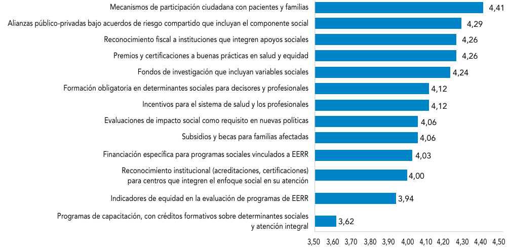 INCENTIVOS PARA INTEGRAR LOS DETERMINANTES SOCIALES EN POLÍTICAS PÚBLICASEn la última pregunta se exploró qué incentivos podrían promover que el diseño e implementación de las políticas públicas sobre enfermedades raras integren de manera efectiva los determinantes sociales que afectan a estas personas y a sus familias. Los incentivos mejor valorados incluyen los mecanismos de participación ciudadana con pacientes y familias (4,41), alianzas público-privadas bajo acuerdos de riesgo compartido que incluyan el componente social (4,29) y el reconocimiento fiscal a instituciones que integren apoyos sociales o los premios y certificaciones a buenas prácticas en salud y equidad (ambos 4,26).También se destacan los fondos de investigación que incluyan variables sociales (4,24), la formación obligatoria en determinantes sociales para decisores y profesionales (4,12) y los incentivos para el sistema de salud y los profesionales (4,12). Por último, los incentivos con puntuaciones inferiores son el reconocimiento institucional mediante acreditaciones o certificaciones (4,00) y los programas de capacitación con créditos formativos sobre determinantes sociales y atención integral (3,62) (Figura 9).