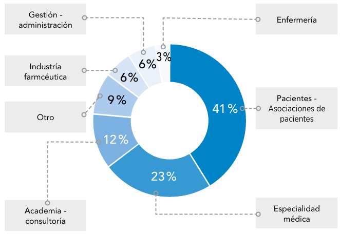 La representación más amplia corresponde a pacientes y asociaciones de pacientes (41%; n=14), seguidos de profesionales de especialidad médica (23%; n=8) y del ámbito académico o de la consultoría (12%; n=4). También participaron otros perfiles (9%; n=3), representantes de la industria farmacéutica (6%; n=2), gestores y personal del ámbito administrativo (6%; n=2), así como profesionales de enfermería (3%; n=1) (Figura 1).Este barómetro se centra en explorar la percepción de los encuestados acerca del papel de los determinantes sociales de la salud en el bienestar de las personas con EERR. En él, se abordan distintos aspectos: los factores sociales más influyentes en la salud de estos pacientes, la prioridad de la equidad en las políticas públicas, la valoración del enfoque actual de los sistemas sanitarios, las áreas de intervención más urgentes y los actores clave que deben implicarse. Asimismo, se analizan los beneficios de integrar los determinantes sociales en el manejo de las EERR, las barreras que dificultan su incorporación en las políticas y los incentivos que podrían favorecer su inclusión efectiva.