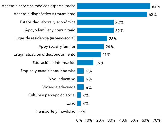 FACTORES SOCIALES QUE MÁS AFECTAN A LA SALUDEn la primera pregunta se indagó sobre cuáles son los factores sociales que más influyen en la salud de las personas con enfermedades raras. Los resultados muestran que los aspectos más señalados se relacionan con el acceso a la atención sanitaria: el 65% de los encuestados mencionó el acceso a servicios médicos especializados y el 62% el acceso al diagnóstico y tratamiento. A continuación, aparecen factores vinculados a la situación económica y social de las familias, como la estabilidad laboral y económica (32%) y el apoyo familiar y comunitario (32%).Otros factores, como empleo y condiciones laborales, nivel educativo y vivienda adecuada fueron señalados por un grupo menor de participantes (6% cada uno), mientras que la edad (3%) y la cultura/percepción social (3%) tuvieron una presencia testimonial, y transporte y movilidad no fue mencionado en ninguna respuesta (Figura 2).