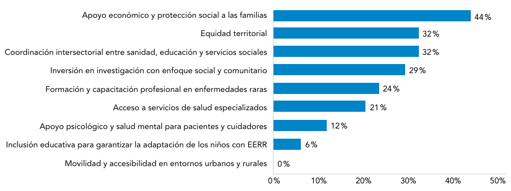 ÁREAS PRIORITARIAS DE INTERVENCIÓN EN POLÍTICAS PÚBLICASLos encuestados identificaron las áreas en las que consideran más urgente intervenir desde las políticas públicas para reducir el impacto de los determinantes sociales en enfermedades raras. La mayoría destacó el apoyo económico y la protección social a las familias (44%), seguido de la coordinación intersectorial entre sanidad, educación y servicios sociales (32%) y la equidad territorial (32%). En menor medida se mencionaron el apoyo psicológico y la salud mental para pacientes y cuidadores (12%) y la inclusión educativa para garantizar la adaptación de los niños con EERR (6%). No se registraron menciones a campañas de sensibilización social y educación pública ni a movilidad y accesibilidad en entornos urbanos y rurales (0%) (Figura 5).