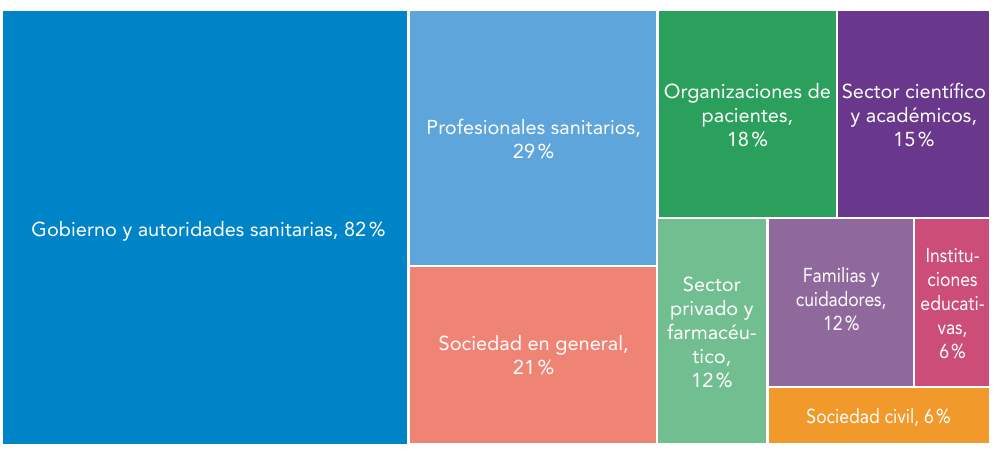 Al indagar sobre los actores que deberían involucrarse más activamente en la reducción de desigualdades en salud en enfermedades raras, los encuestados coincidieron en situar al gobierno y a las autoridades sanitarias como el agente principal, con un 82% de las menciones. A continuación, se destacan los profesionales sanitarios (29%) y la sociedad en general (21%), seguidos de las organizaciones de pacientes (18%) y del sector científico y académico (15%). Otros actores mencionados en menor medida fueron el sector privado y farmacéutico (12%), las familias y cuidadores (12%), la sociedad civil (6%) y las instituciones educativas (6%) (Figura 6).