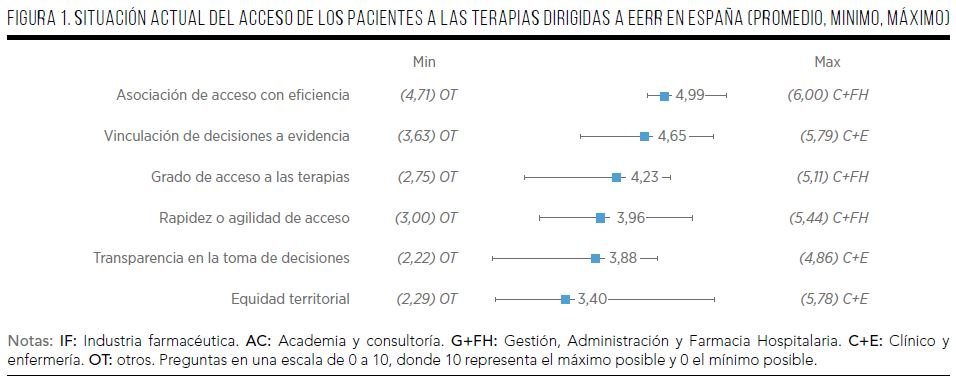 Los clínicos y gestores parecen representar los grupos más optimistas en relación a la situación actual de acceso, ya que, en promedio, otorgan mayores puntuaciones que los demás grupos (ligeramente por encima de los 5 puntos sobre 10, mientras que el resto oscila entre 3,7 y 4,0 puntos). Profesionales sanitarios y pacientes coinciden en señalar que la mayor deficiencia está relacionada con la rapidez y la equidad en el acceso. Para la industria, los principales puntos débiles son la equidad y la transparencia en las decisiones, mientras que para la academia/consultoría son el grado de acceso y la rapidez en el acceso. Por su parte, los gestores opinan que la mayor debilidad está relacionada con la transparencia y la vinculación de las decisiones con la eficiencia de las terapias.