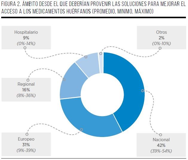 El ámbito nacional fue el preferido en todos los subgrupos analizados, si bien el orden de los demás ámbitos difiere en función del perfil de encuestados. Así, para los pacientes el ámbito nacional de las soluciones es tan importante como el europeo (ambos con un 39%); para la industria farmacéutica y los académicos/ consultores, el ámbito regional de las soluciones sería más relevante que el europeo.