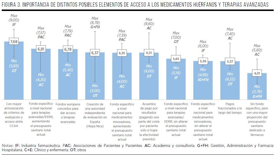 Los tres elementos considerados como más relevantes o útiles en los procesos de acceso a los MMHH y terapias avanzadas en España son una mayor armonización de los criterios de evaluación y acceso entre las CCAA (7,68 sobre 10), seguido de la creación de un fondo específico nacional aumentando el presupuesto sanitario actual (6,81) y la existencia de fondos europeos concretos para dar acceso a las terapias avanzadas (6,78). Los tres elementos considerados como menos relevantes fueron el incremento del presupuesto sanitario dedicado a los fármacos, sin la creación de fondos específicos (4,01), la utilización de esquemas de pagos fraccionados a lo largo del tiempo (5,37) y la creación de un fondo nacional para medicamentos innovadores, sin alterar el presupuesto sanitario total actual.