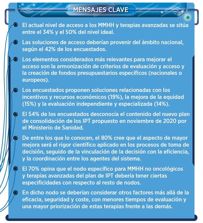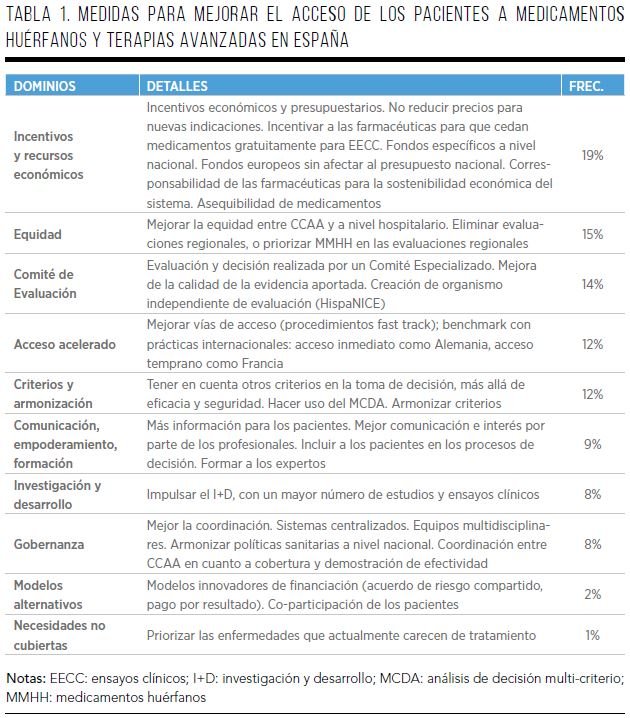 Además de sobre estos elementos pre-especificados, también se planteó a los encuestados una pregunta abierta sobre posibles medidas que podrían mejorar el acceso a los MMHH y a las terapias avanzadas, cuyas respuestas fueron agrupadas en 10 dominios (Tabla 1).
